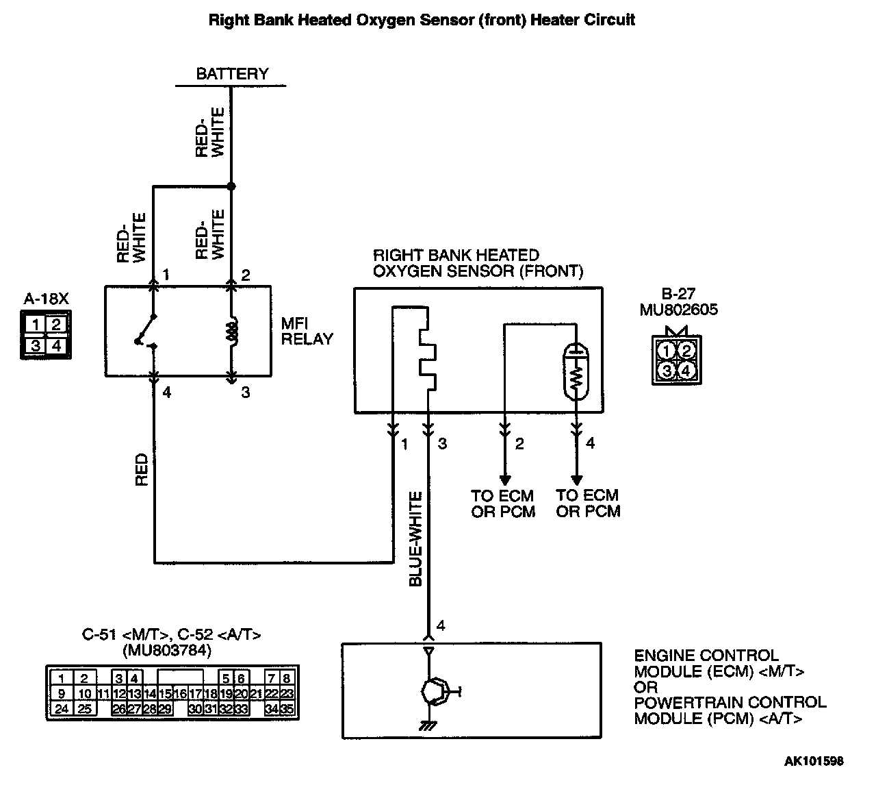 - Power is supplied from the MFI relay (terminal 4) to the right bank heated oxygen sensor (front) heater.