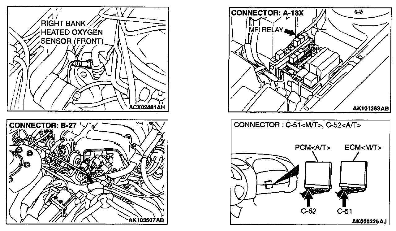 STEP 9. Check for harness damage between MFI relay connector A-18X terminal 4 and right bank heated oxygen sensor (front) connector B-27 terminal 1.