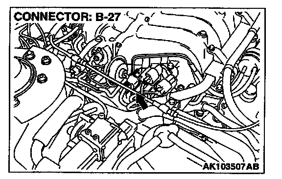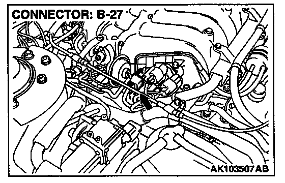 1. Disconnect right bank heated oxygen sensor (front) connector B-27 and connect test harness special tool, MD998464, to the connector on the right bank heated oxygen (front) sensor side.