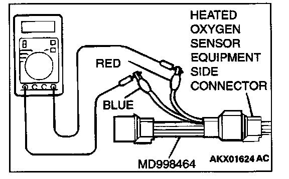 2. Measure the resistance between heated oxygen sensor connector terminal 1 (red clip) and terminal 3 (blue clip).