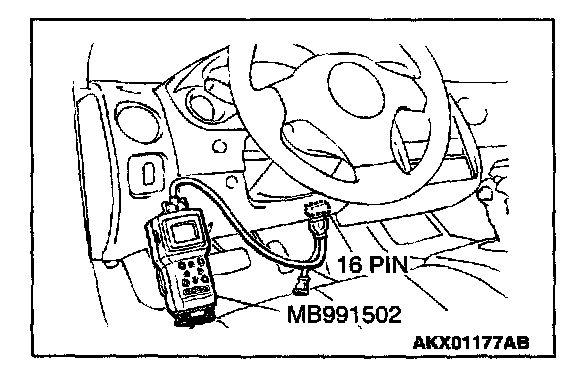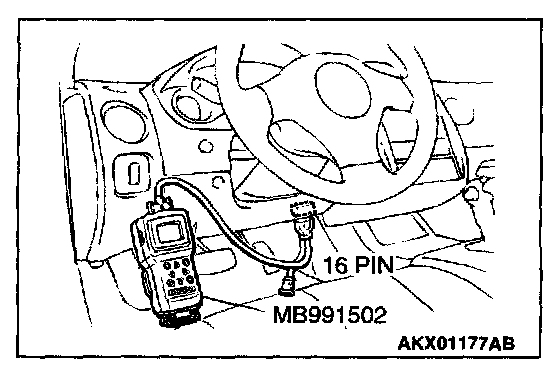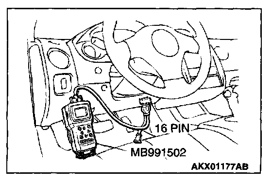 CAUTION: To prevent damage to scan tool MB991502, always turn the ignition switch to the "LOCK" (OFF) position before connecting or disconnecting scan tool MB991502.