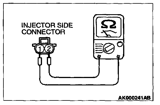 2. Measure the resistance between each injector side connector terminal 1 and 2.