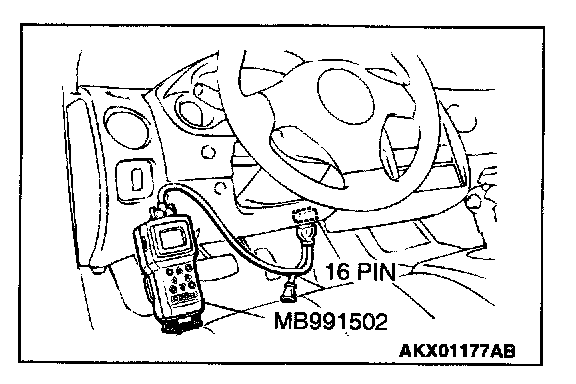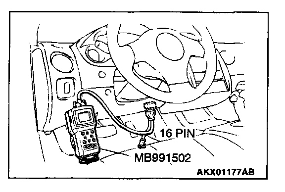 CAUTION: To prevent damage to scan tool MB991502, always turn the ignition switch to the "LOCK" (OFF) position before connecting or disconnecting scan tool MB991502.