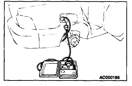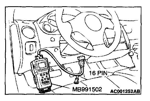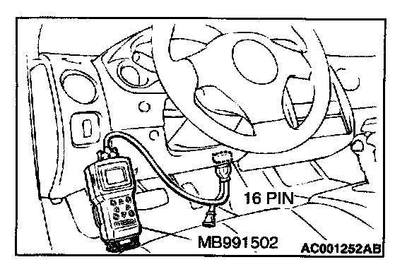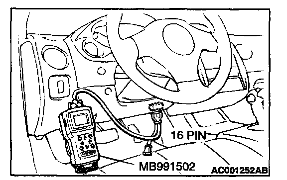 CAUTION: To prevent damage to scan tool MB991502, always turn the ignition switch to the "LOCK" (OFF) position before connecting or disconnecting scan tool MB991502.