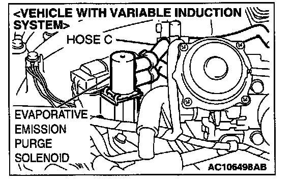3. Disconnect hose C from the evaporative emission purge solenoid side, and connect a hand vacuum pump to the nipple of the evaporative emission purge solenoid.