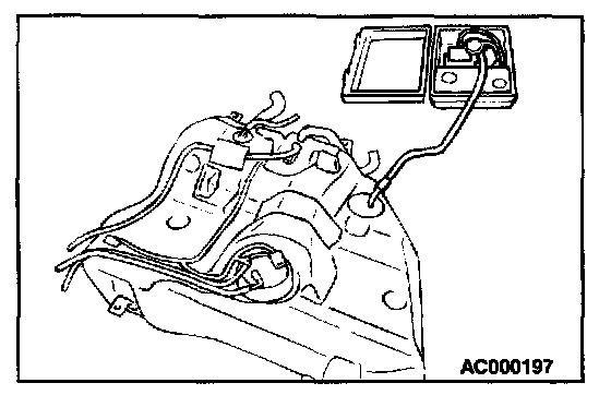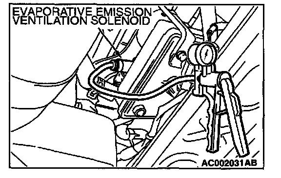 5. Set scan tool MB991502 to actuator test mode for item 29: Evaporative Emission Ventilation Solenoid. When the evaporative emission ventilation solenoid is operated, apply a pressure on the hand vacuum pump and confirm that air is maintained.