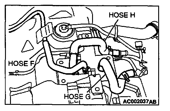 1. Remove the module bracket mounting bolts, and disconnect hose G from the evaporative emission ventilation solenoid side, and plug the hoses from which the hoses have been disconnected.