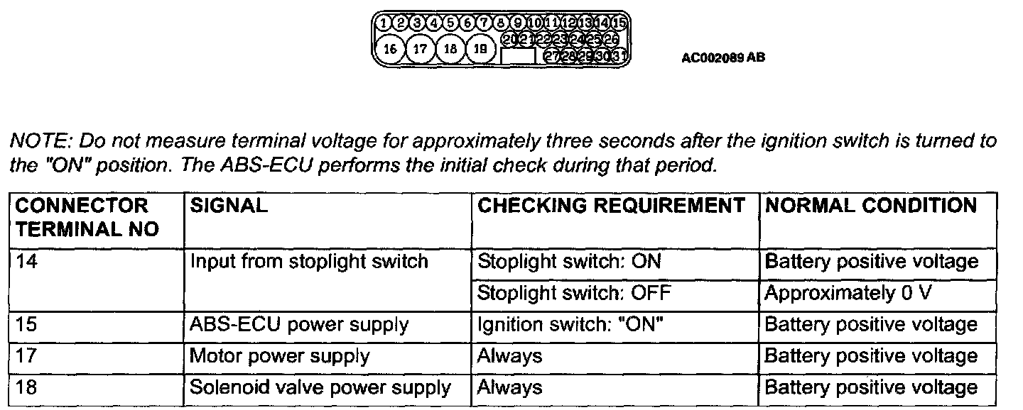NOTE: Do not measure terminal voltage for approximately three seconds after the ignition switch is turned to the "ON" position. The ABS-ECU performs the initial check during that period.