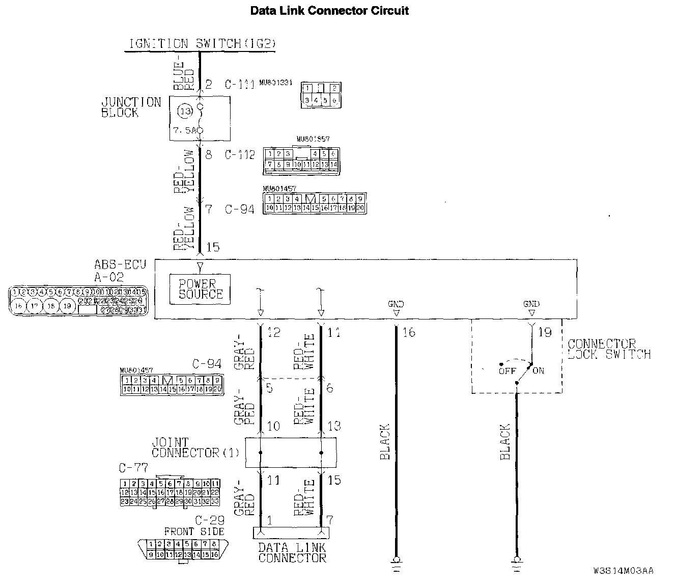 ^ When the data link connector's diagnostic test mode control terminal (terminal 1) is grounded, the ABS-ECU (terminal 12) will go into diagnostic mode.