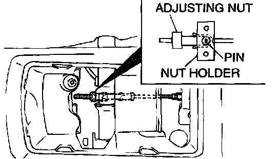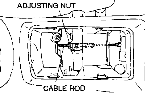 3. Remove the floor console cup tray or arm rest assembly, loosen the adjusting nut as far as the end of the cable rod to release the cable, and then adjust by the following procedure: