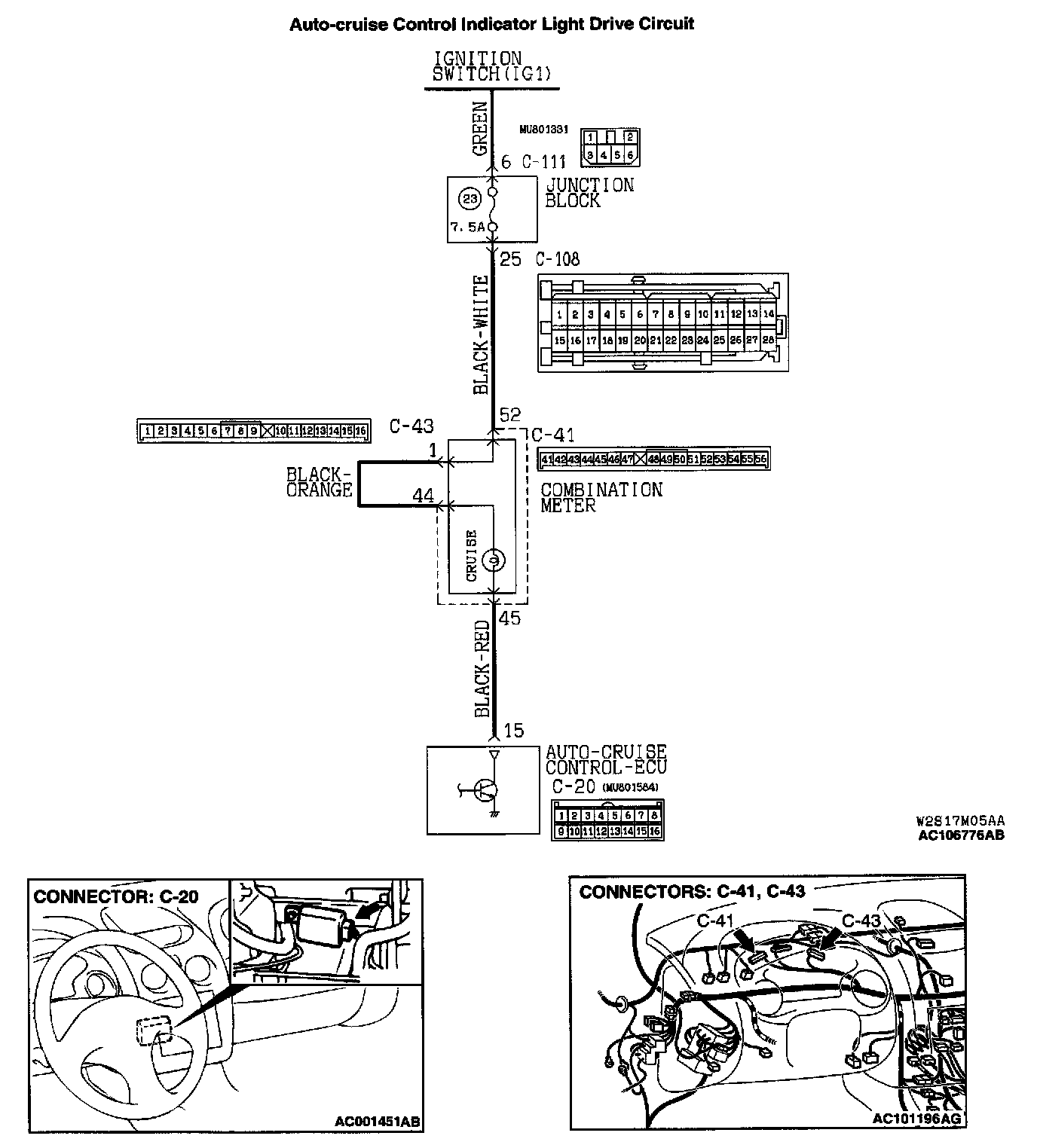 STEP 11. Check the harness wire between combination meter connector C-41 (terminal number 52) and auto-cruise control-ECU connector C-20 (terminal number 15).