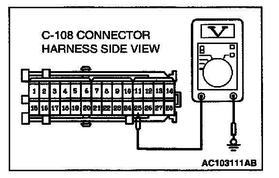STEP 3. Check the output circuit voltage at junction block connector C-108 (terminal number 25) by backprobing.