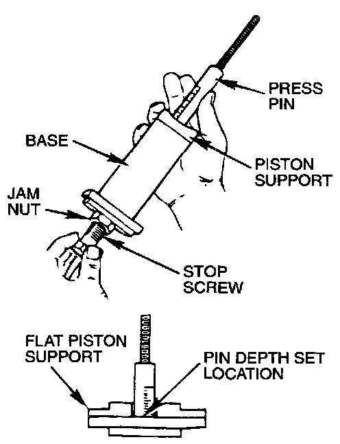 1. Thread the stop screw and jam nut assembly into the base. Fit the correct piston support on top of the base. Insert the press pin, threaded end up, into the hole in the piston support until the press pin touches the stop screw.