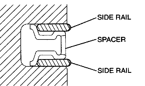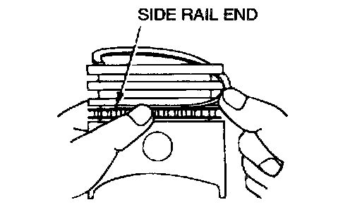 2. Install the upper side rail. To install the side rail, first fit one end of the rail into the piston groove, then press the remaining portion into the position by finger. See illustration.
