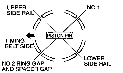 2. Arrange the piston ring and oil ring gaps (side rail and spacer) as shown in the illustration.