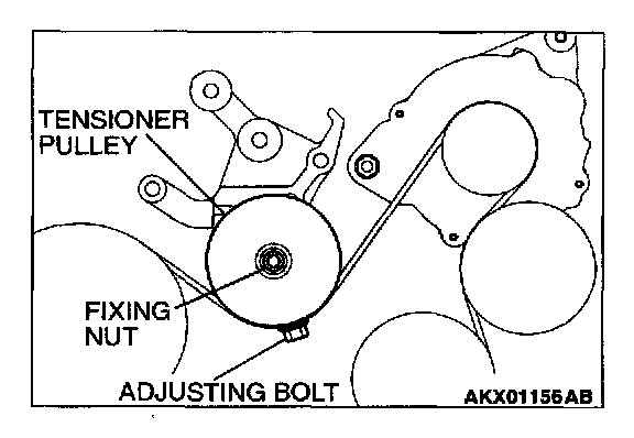 2. With the tensioner pulley fixing nut temporarily tightened to 15 ± 5 Nm (11 ± 4 ft-lb), set the belt tension or defection amount to the standard value using the adjusting bolt.