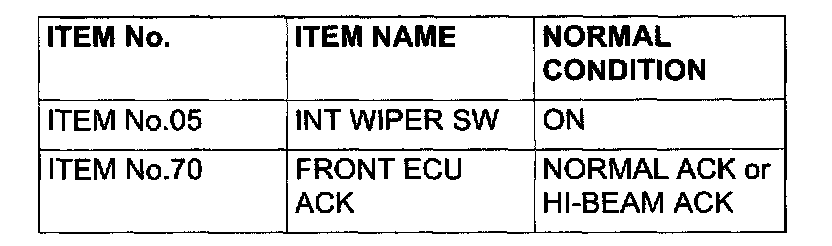 Q: Does the scan tool display the items "INT WIPER" and "FRONT ECU ACK" as normal condition?