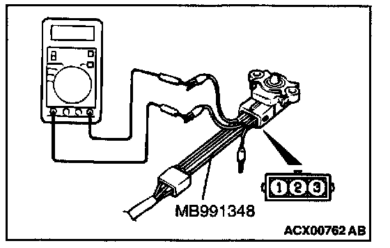 1. Disconnect the fuel tank differential pressure sensor connector and connect special tool MB991348 between the terminals of the disconnected connector.