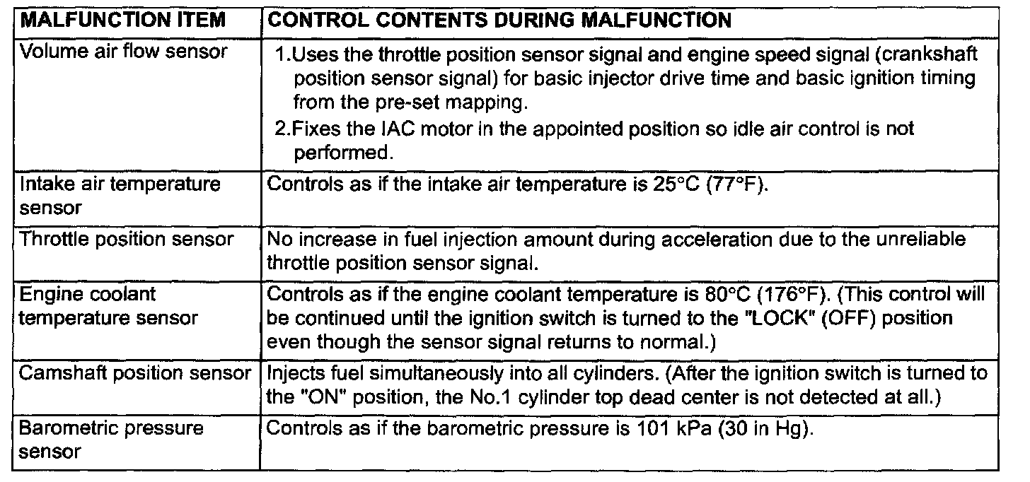 When the main sensor malfunctions are detected by the diagnostic test mode, the vehicle is controlled by means of the defaults.