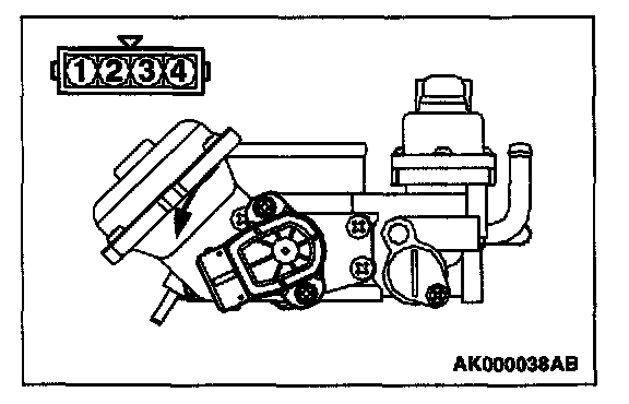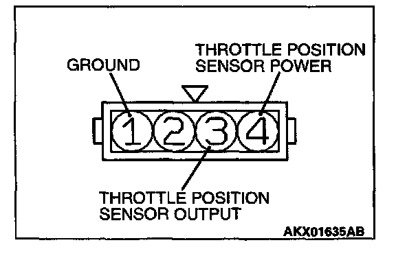 3. Connect an ohmmeter between terminals 1 (ground) and 3 (output), or between terminals 3 (output) and 4 (power). Then, make sure that the resistance changes smoothly when the throttle valve is slowly moved to the fully open position.