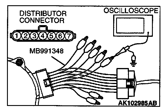 1. Disconnect the connector, and connect test harness special tool, (MB991348), in between. (All terminals should be connected.)