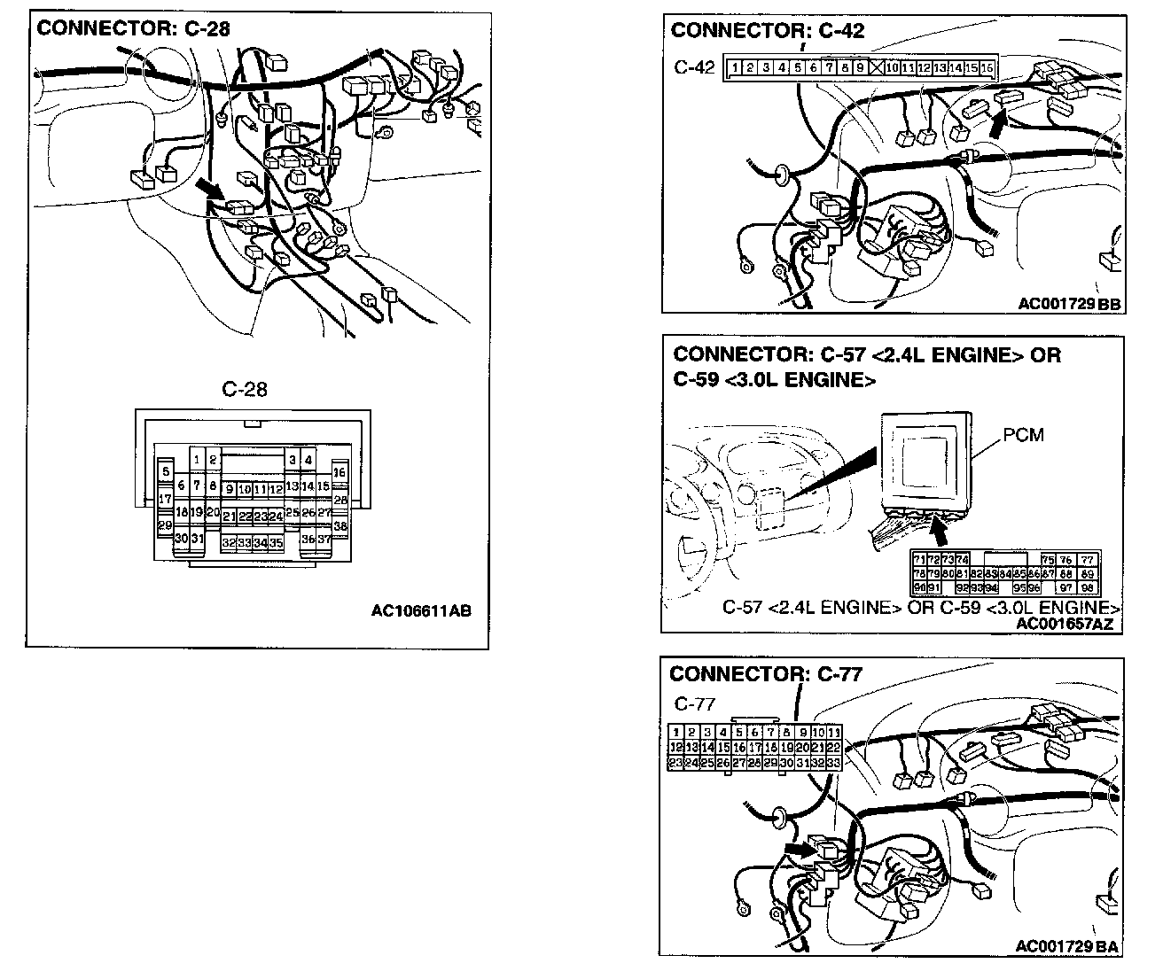 STEP 5. Check connectors C-57 <2.4L Engine> or C-59 <3.0L Engine> at PCM, C-28 at intermediate connector, C-77 at joint connector and C-42 combination meter connector for damage.