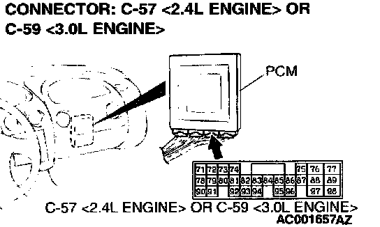 STEP 4. Check connector C-57 <2.4L Engine> or C-59 <3.0L Engine> at PCM for damage.
