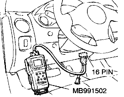 CAUTION: To prevent damage to scan tool MB991502, always turn the ignition switch to the "LOCK" (OFF) position before connecting or disconnecting scan tool MB991502.