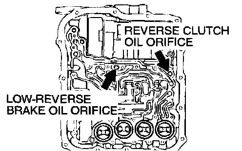 2) Blow 108 kPa (15 psi) compressed air into the reverse clutch oil orifice of the transaxle case, and check if the reverse clutch piston moves and air pressures are maintained in that condition. Repeat for the low-reverse brake.