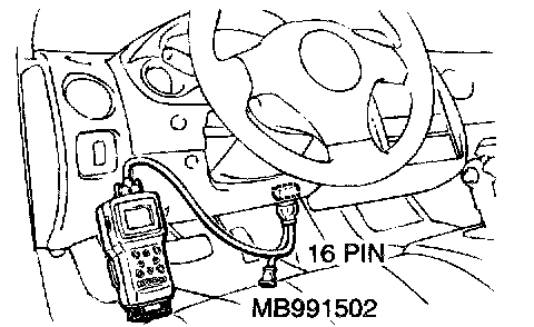 CAUTION: To prevent damage to scan tool MB991502, always turn the ignition switch to the "LOCK" (OFF) position before connecting or disconnecting scan tool MB991502.