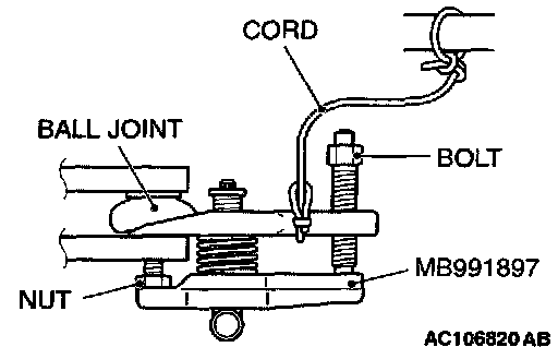 ^ Do not remove the nut from ball joint. Loosen it and use special tool MB991897 to avoid possible damage to ball joint threads.