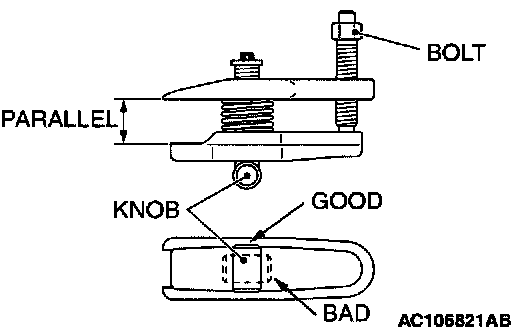 2. Turn the bolt and knob as necessary to make the jaws of special tool MB991897 parallel, tighten the bolt by hand and confirm that the jaws are still parallel.