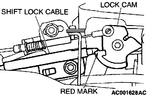 2. Fasten the shift lock cable at the position where the end of the shift lock cable is positioned above the red marking.