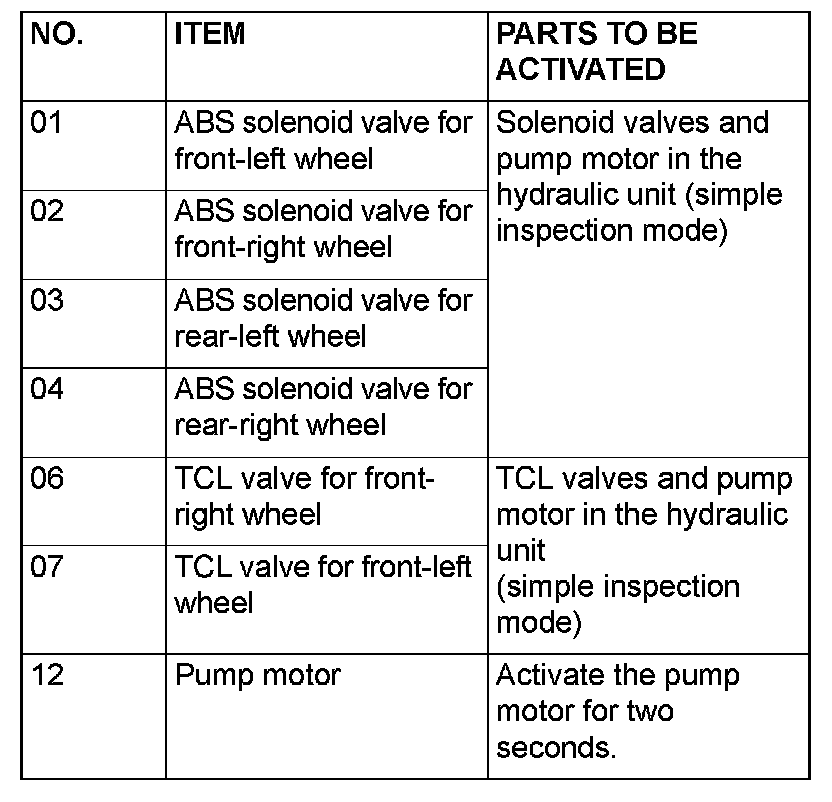 NOTE: If the ABS-ECU is inoperative, actuator testing cannot be carried out.
