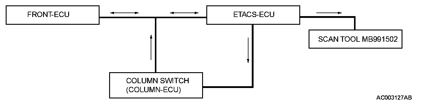 As shown signal wires used exclusively for transmitting multiplex signal data connect the ETACS-ECU, front-ECU, column switch (incorporating the column-ECU) and these components communicate with each other.