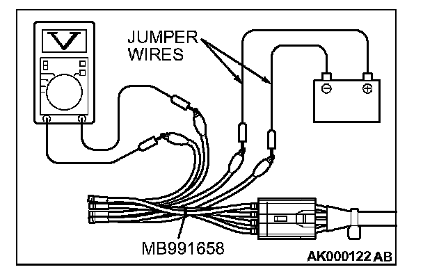 1. Disconnect the heated oxygen sensor connector and connect special tool MB991658 to the connector on the heated oxygen sensor side.