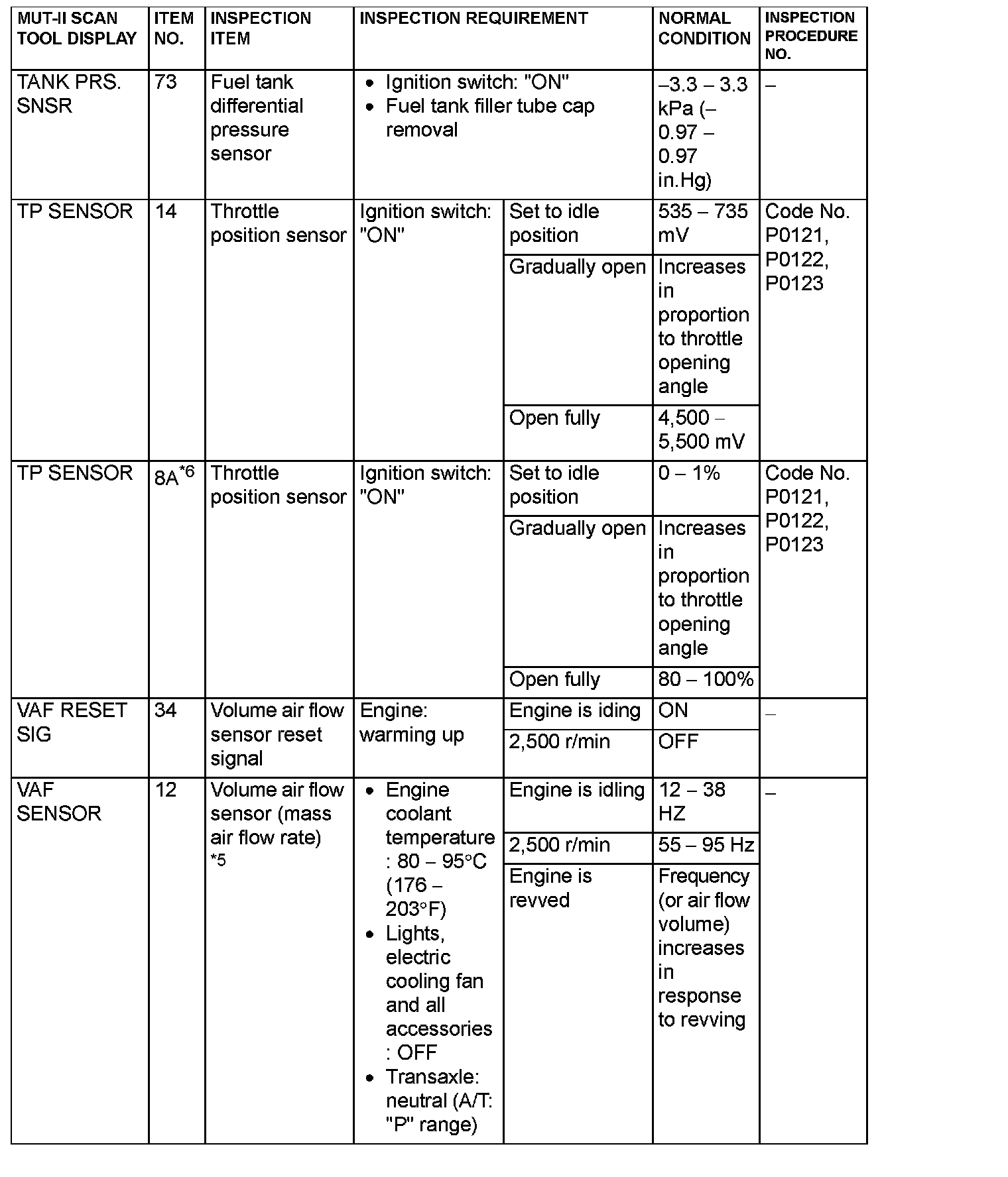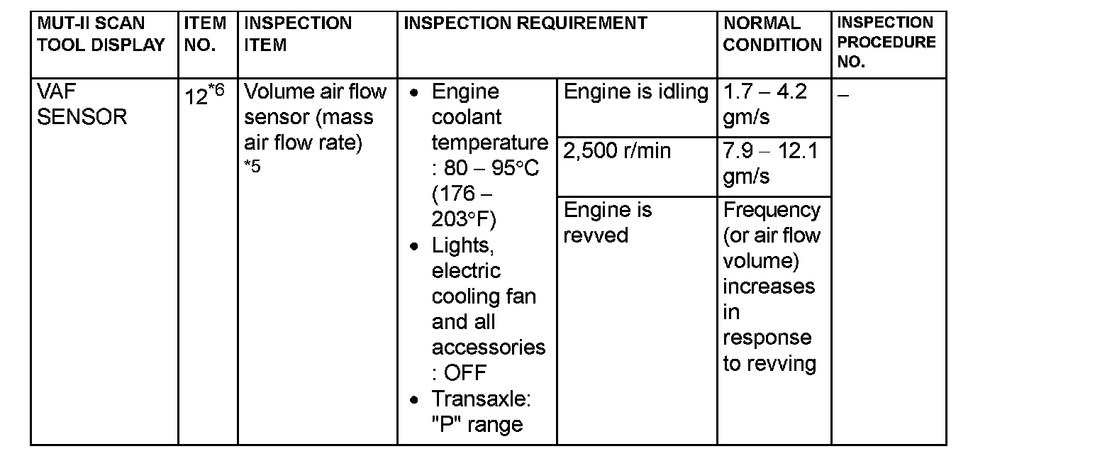 NOTE: *5: In a new vehicle [driven approximately 500 km (311 mile) or less], the volume air flow sensor output frequency is sometimes 10% higher than the standard frequency.