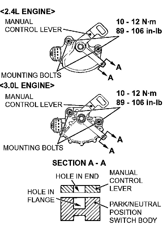 4. Loosen the park/neutral position switch body mounting bolts and turn the park/neutral position switch body so the hole in the end of the manual control lever and the hole (section A-A in the image on the left) in the flange of the park/neutral position switch body flange are aligned.