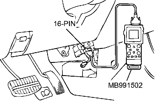 CAUTION: To prevent damage to scan tool MB991502, always turn the ignition switch to the "LOCK" (OFF) position before connecting or disconnecting scan tool MB991502.