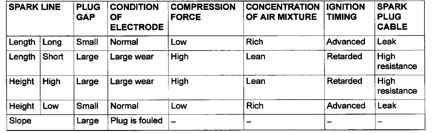 Point A: The height, length and slope of the spark line (refer to abnormal waveform examples 1, 2, 3 and 4) show the following trends.