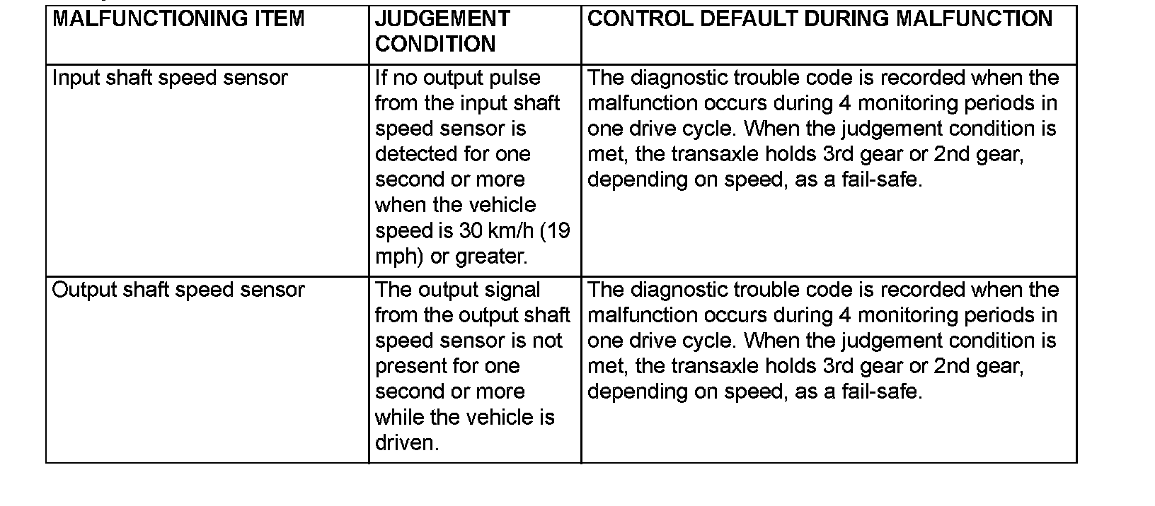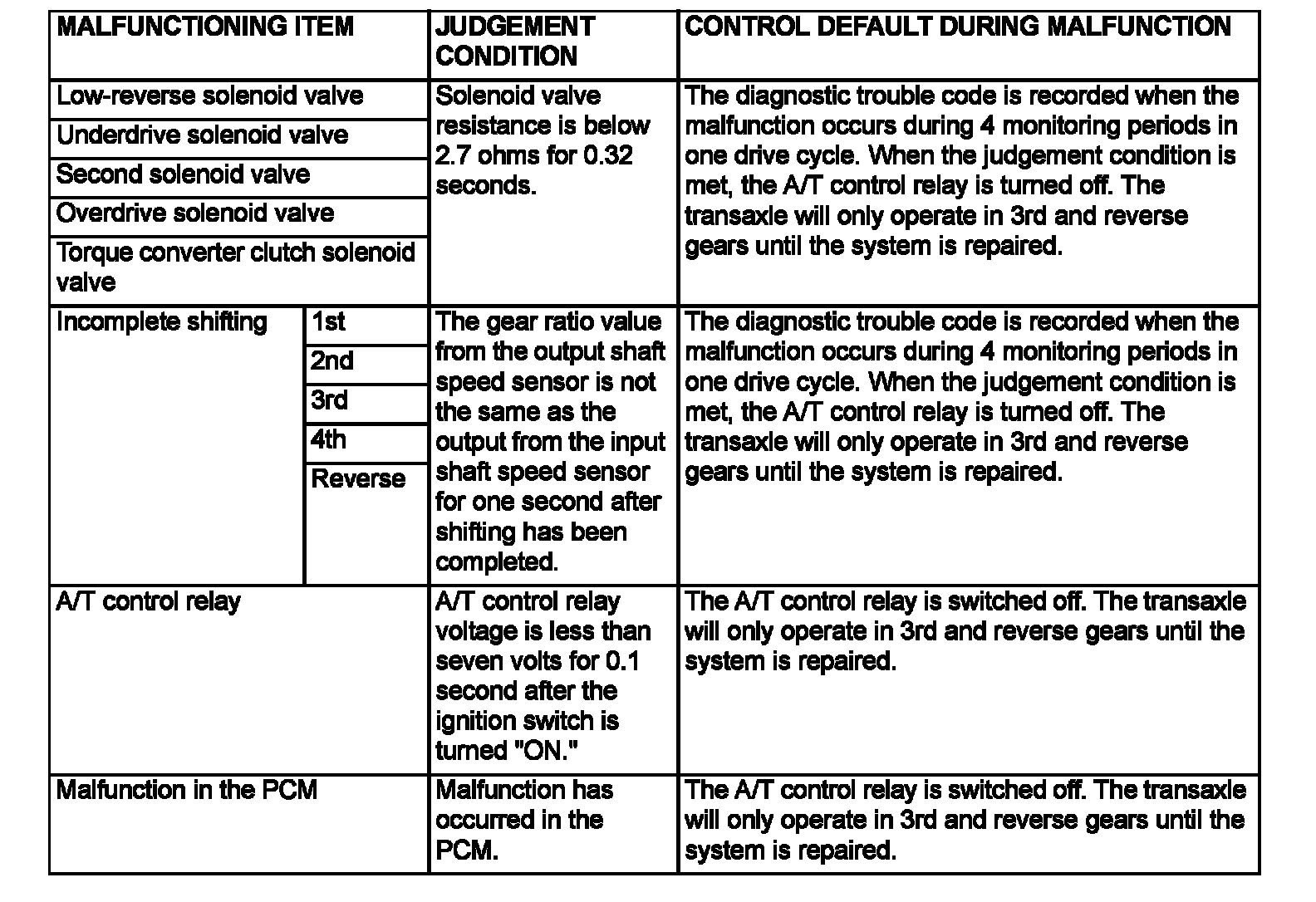 When a malfunction of a main sensor or actuator is detected by the PCM, the transaxle is controlled by pre-set control logic to maintain safe conditions for driving.