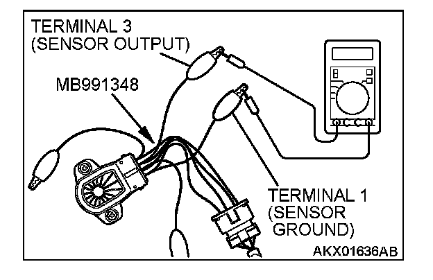 2. Connect a digital voltmeter between throttle position sensor terminal No. 3 (sensor output) and terminal No. 1 (sensor ground).