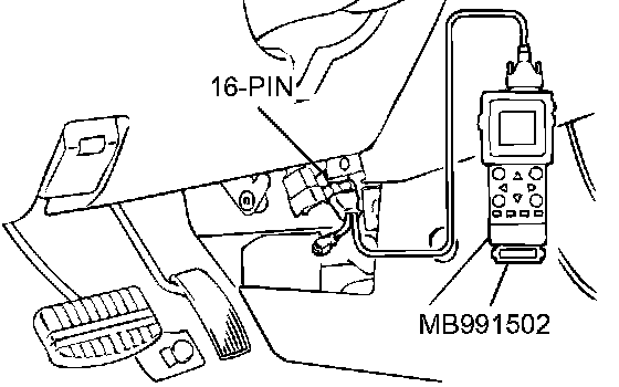 CAUTION: To prevent damage to scan tool MB991502, always turn the ignition switch to the "LOCK" (OFF) position before connecting or disconnecting scan tool MB991502.