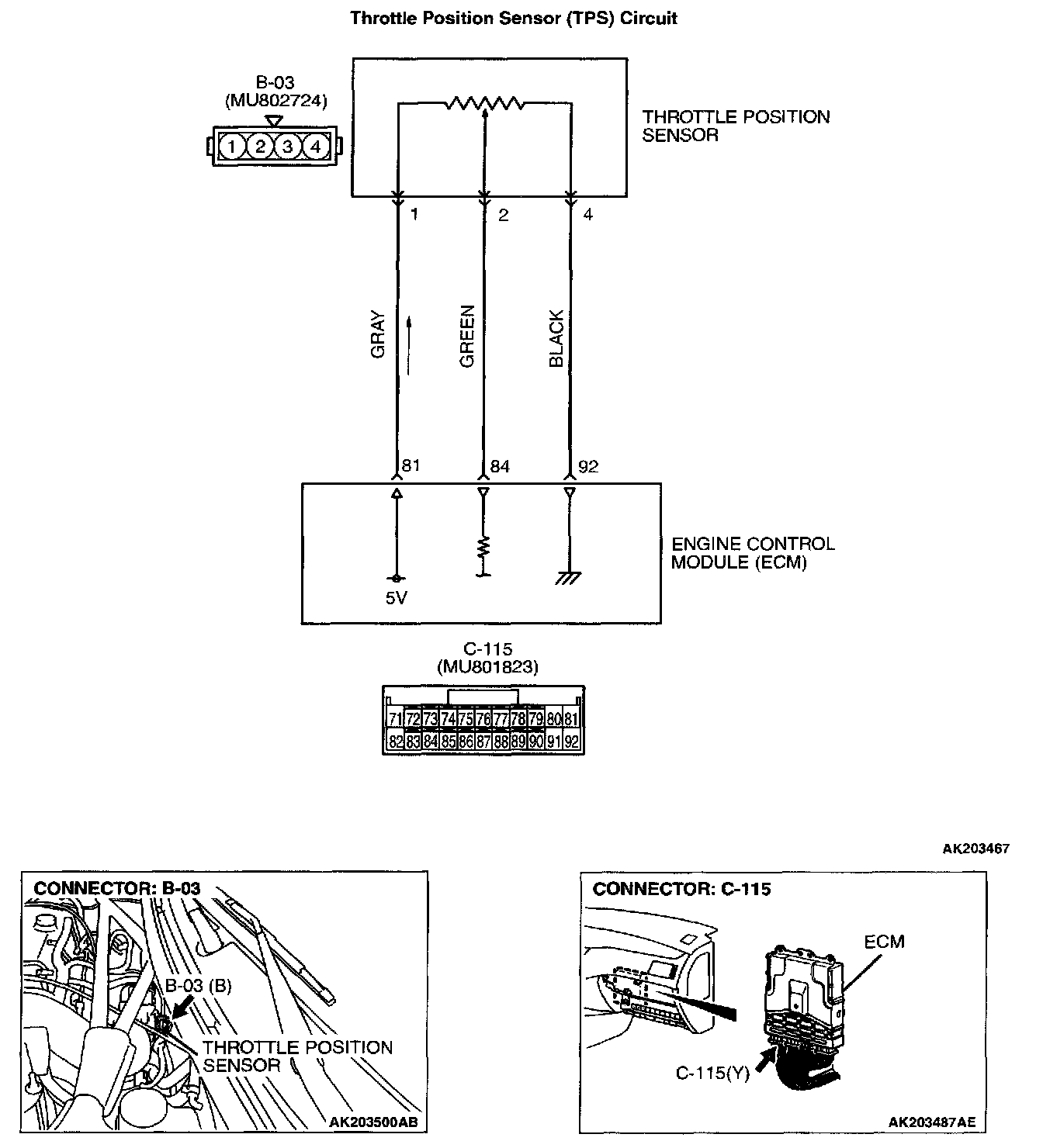 - A 5-volt power supply is applied on the throttle position sensor power terminal (terminal No. 1) from the ECM (terminal No. 81). The ground terminal (terminal No. 4) is grounded with ECM (terminal No. 92).