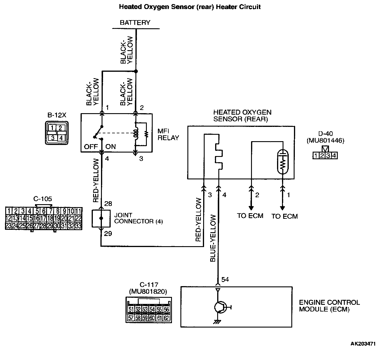 - Power is supplied from the MFI relay (terminal No. 4) to the heated oxygen sensor (rear) heater.