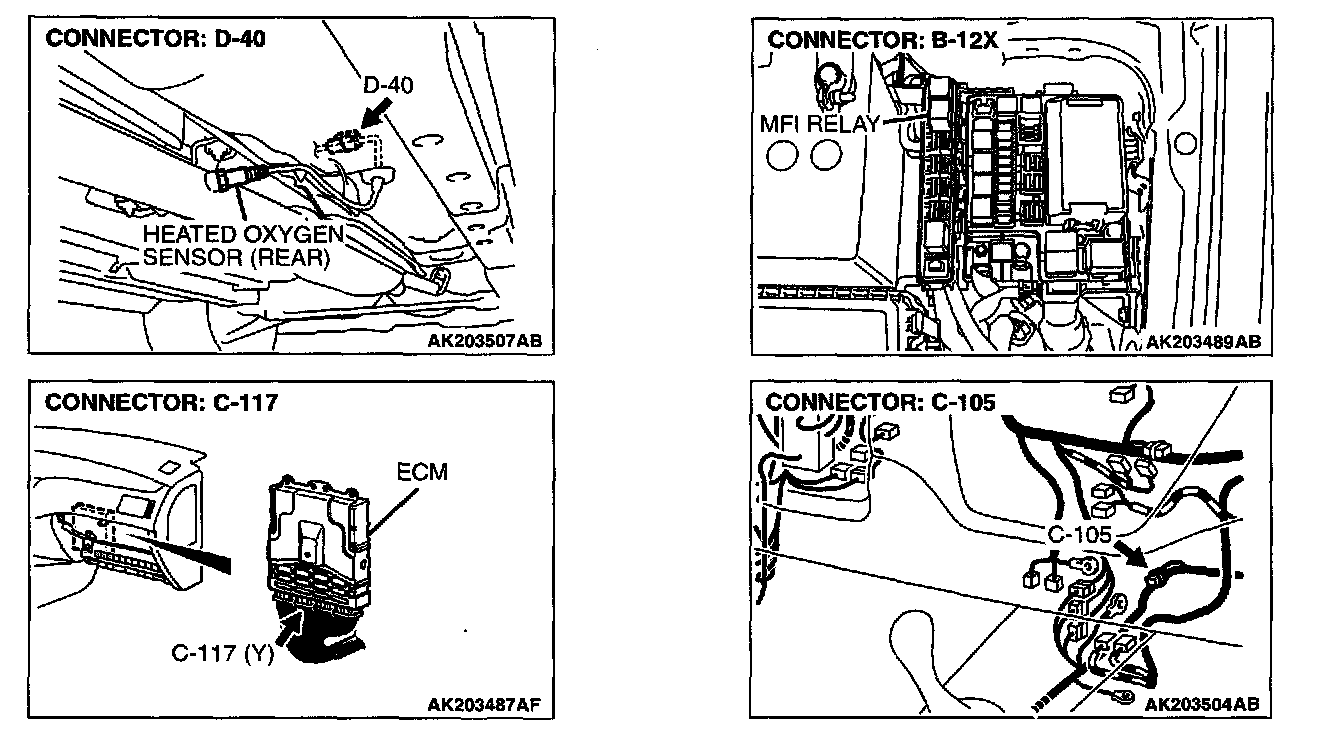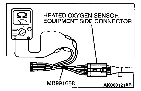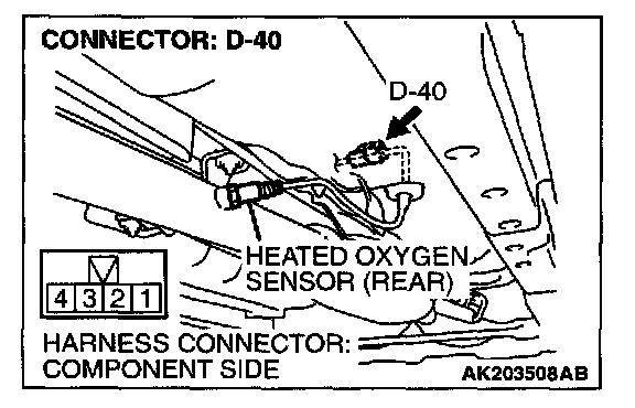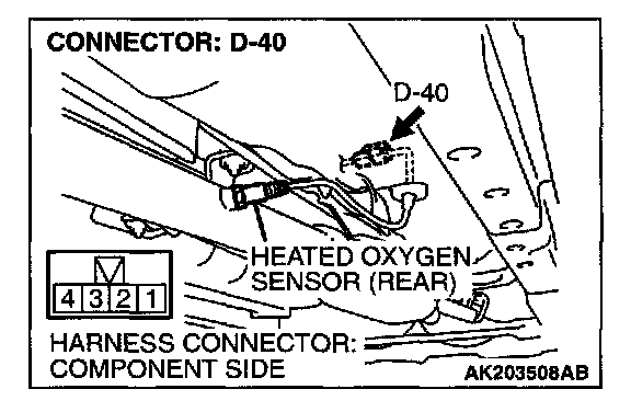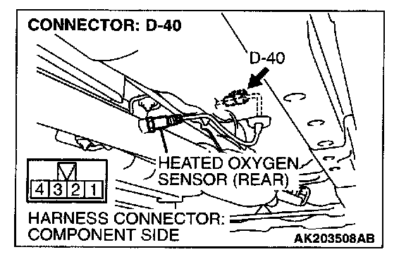1. Disconnect heated oxygen sensor (rear) connector D-40 and connect test harness special tool, MB991658, to the connector on the heated oxygen (rear) sensor side.