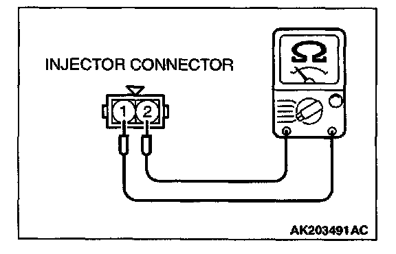 2. Measure the resistance between injector side connector terminal No. 1 and No. 2.
