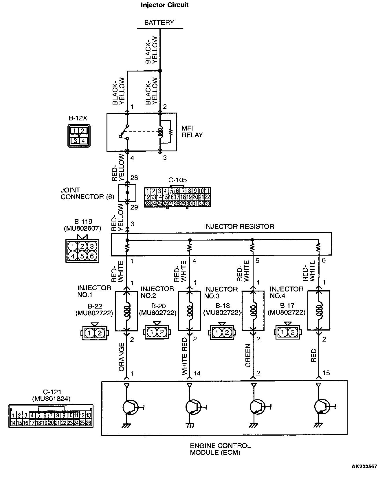 - The power for the injector is supplied by the No. 4 terminal of the MFI relay via an injector resistor.