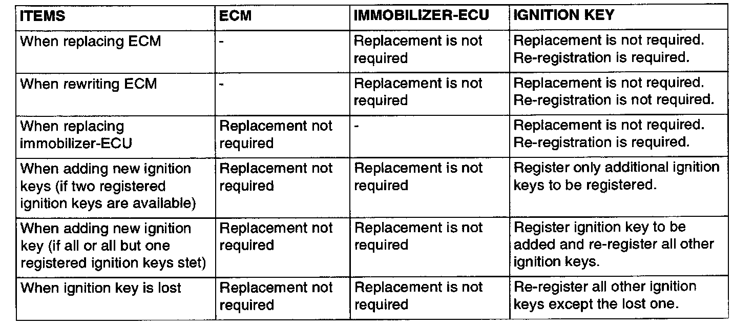 To replace immobilizer system related parts, refer to the table. When the ignition key is re-registered with scan tool MB991958, the originally registered ignition key registration information will be lost.