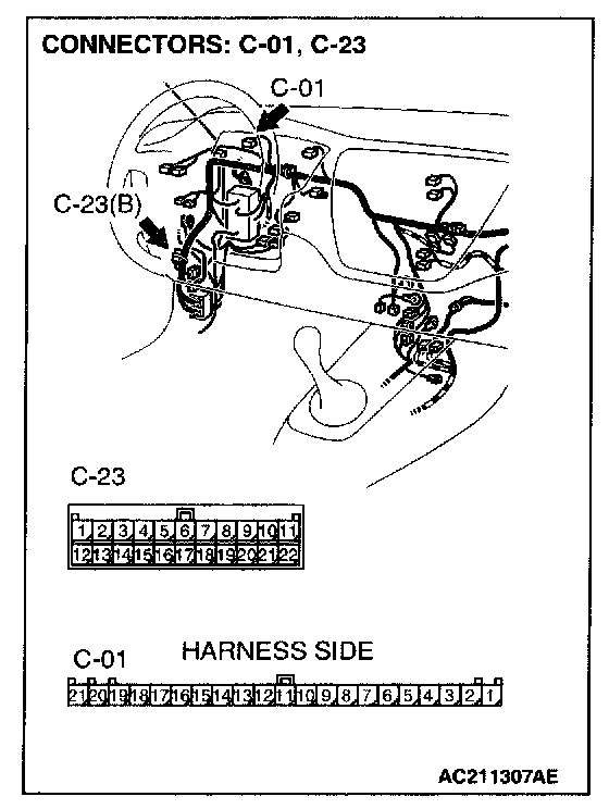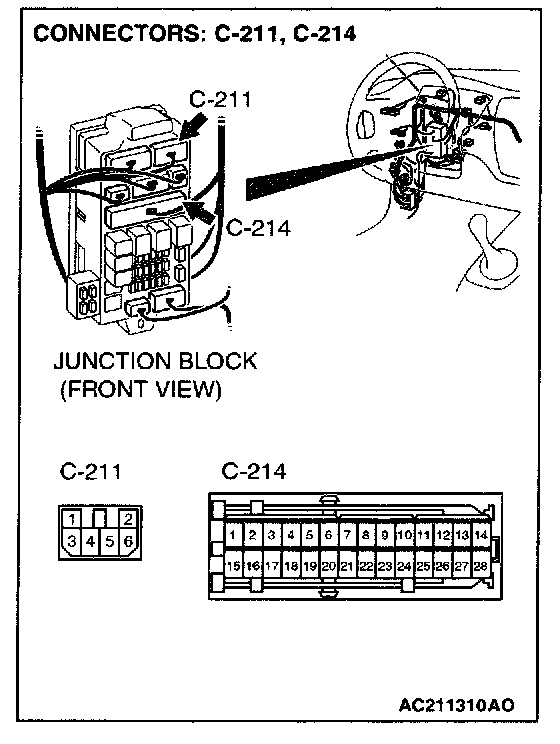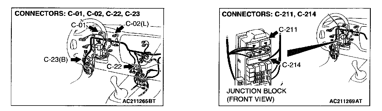 NOTE: Also check junction block connector C-211 and C-214 and joint connector C-23 for loose, corroded, or damaged terminals, or terminals pushed back in the connector. If junction block connector C-211 or C-214 or joint connector C-23 is damaged, Repair or replace the damaged components). Refer to Harness Connector Inspection.